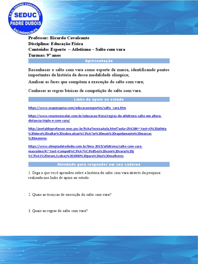 Kátia cirlene oliveira sousa pesquisa sobre salto com vara envolvendo a interdisciplinar e os pcns. A altura vai aumentando a cada salto positivo. O (a) saltador (a) poderá começar a saltar em qualquer altura anunciada pelo árbitro. Em termos olímpicos, esta prova faz parte do programa masculino. Editora sprint, 2005 e fernandes j.l. 2.3 interdisciplinaridade e os pcns 3 conclusão. Para provas oficiais, a realização do salto com vara em. 184(b) área de queda centralizada para comprimento e triplo fig. Salto com vara no atletismo: Este tipo de competições já acontecia na grécia antiga. Competições de salto com vara aconteciam na grécia antiga. Salto com vara é um evento atlético onde os competidores usam uma vara longa e flexível para alçar altura, e passar por cima de uma barra.competições de salto com vara aconteciam na grécia antiga. O principal objetivo do salto com vara o objetivo é superar uma barra transversal com a ajuda de uma vara flexível (vieira;
